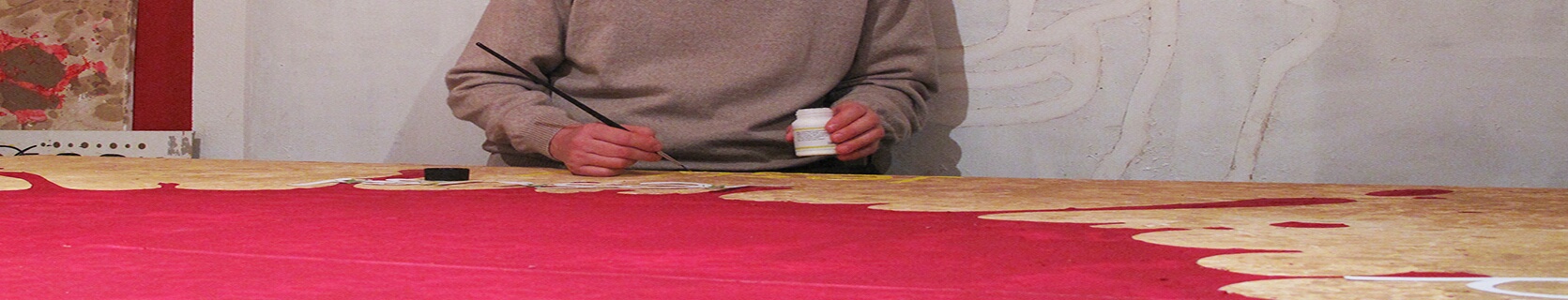 4. Zuletzt werden die gehärteten Erdpigmente fast vollständig von der Leinwand entfernt. Übrig bleiben die charakteristischen, fühlbaren Einprägungen im Leinwandstoff. Indirekte Beleuchtung bringt dieses Zwischenergebnis erst richtig zur Geltung.